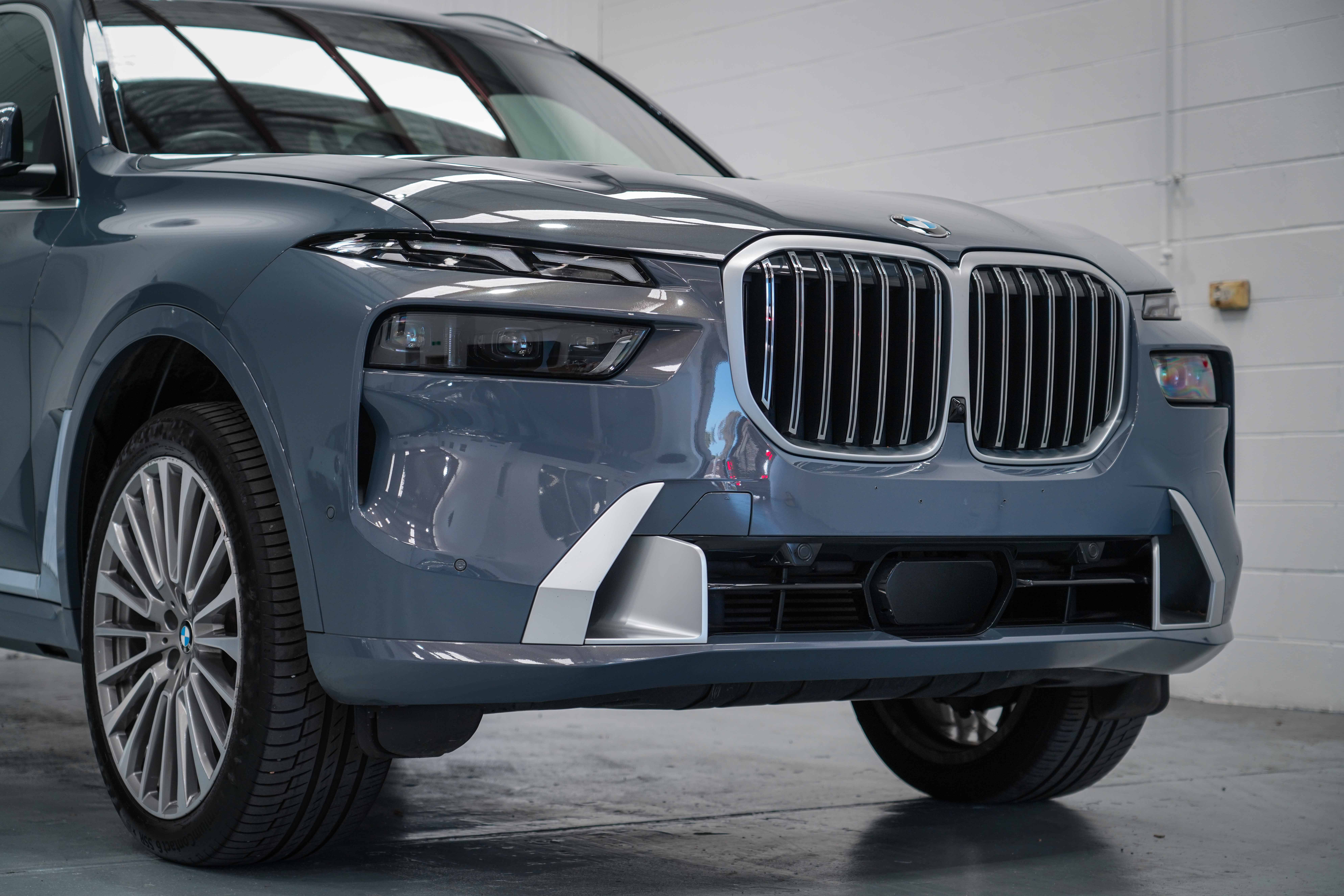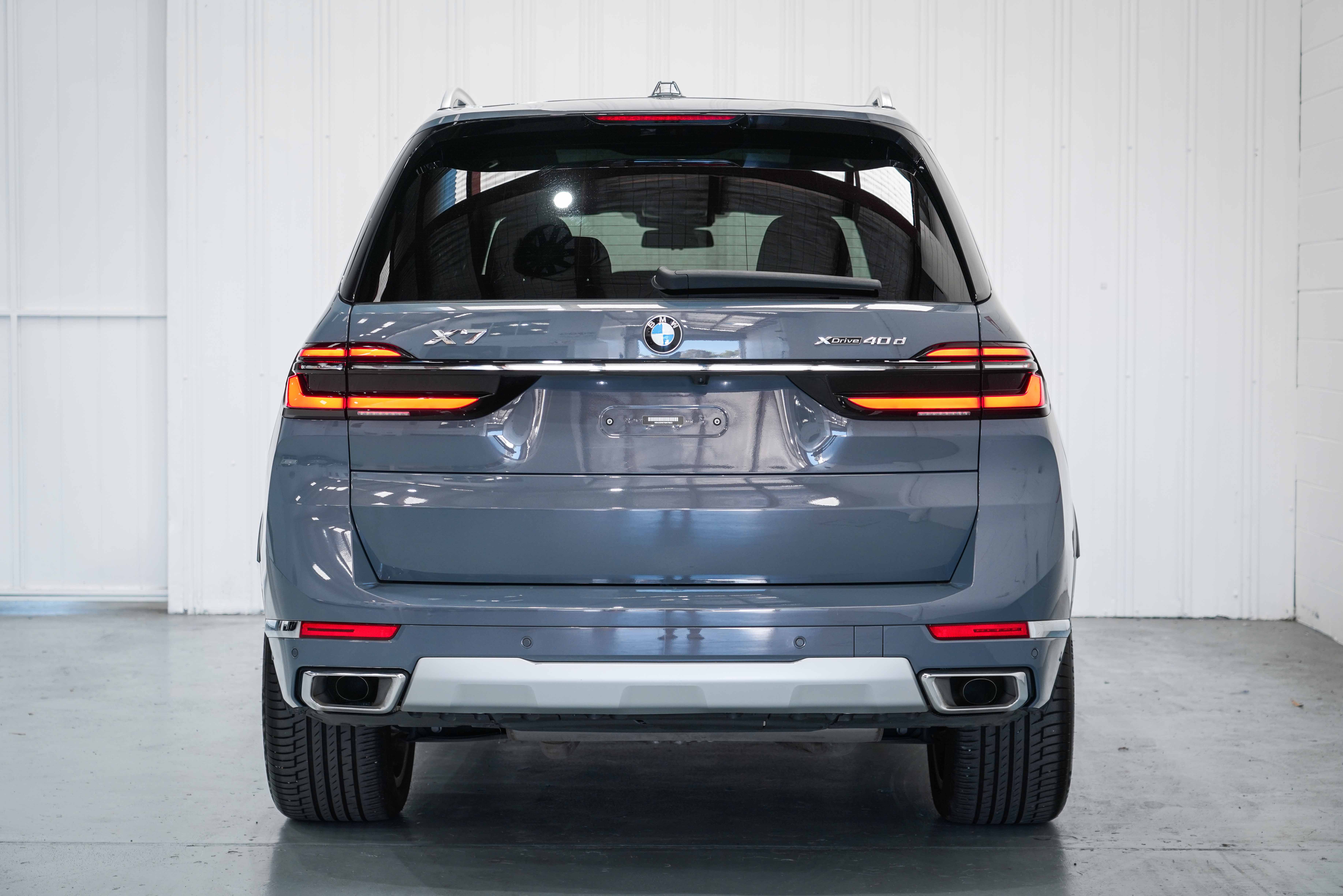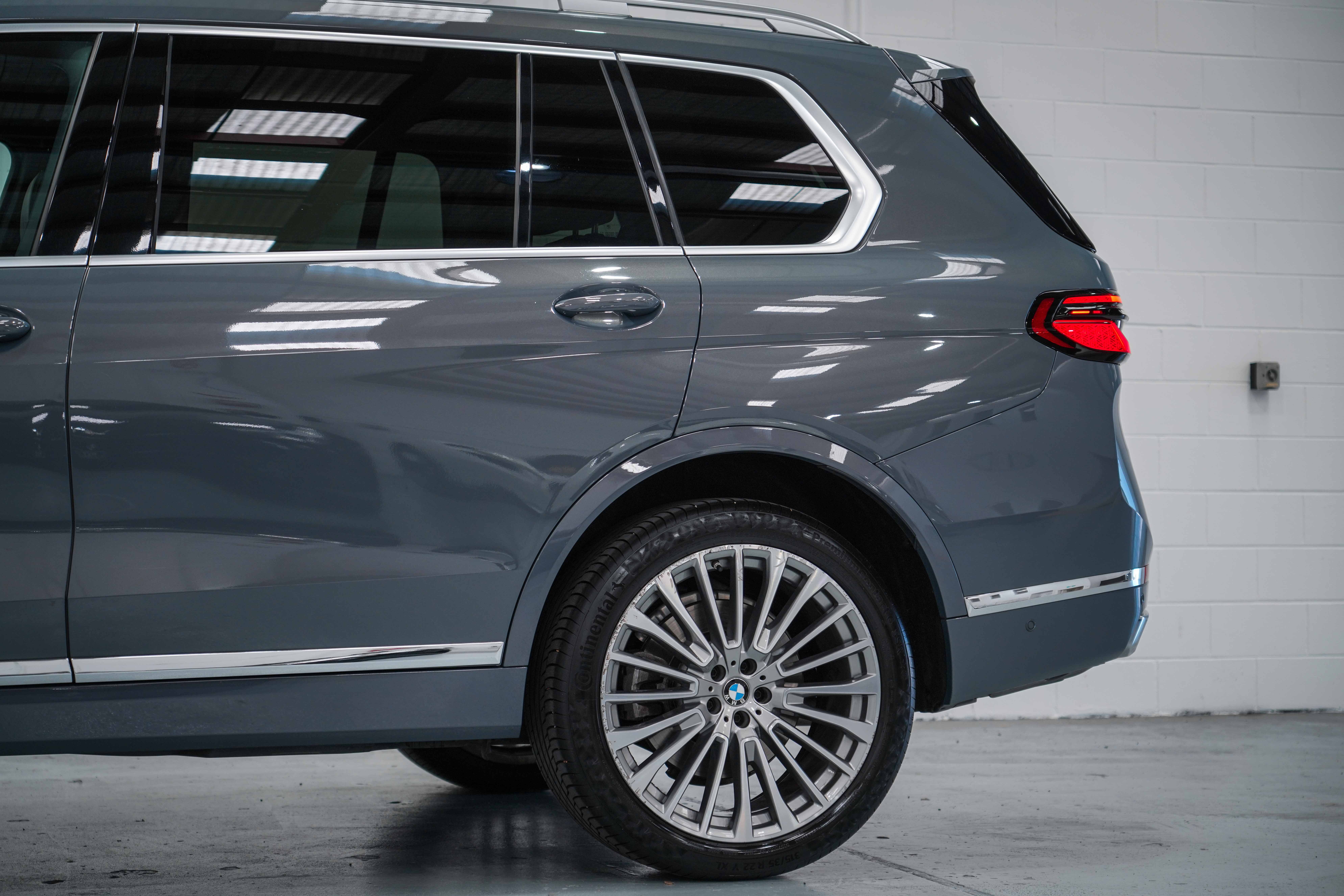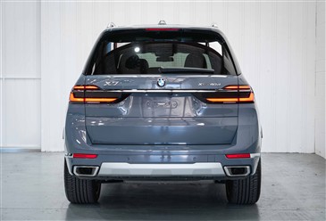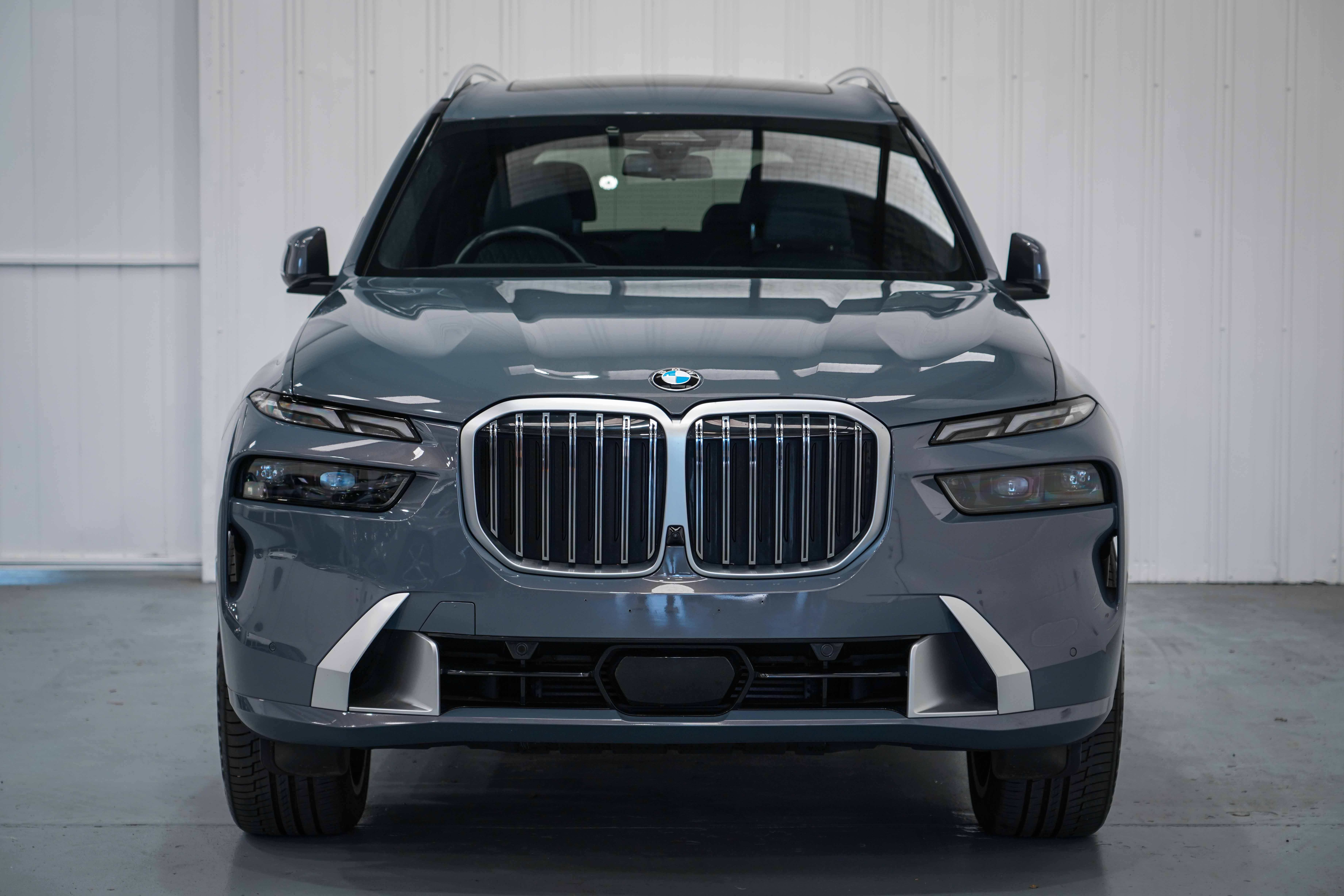 Distinctive chrome finishes on the exterior trim, refined interior materials, bright silver lower bumper inserts, and high-gloss details — giving the X7 a sophisticated, luxury-first presence compared to the sportier M Sport trim.