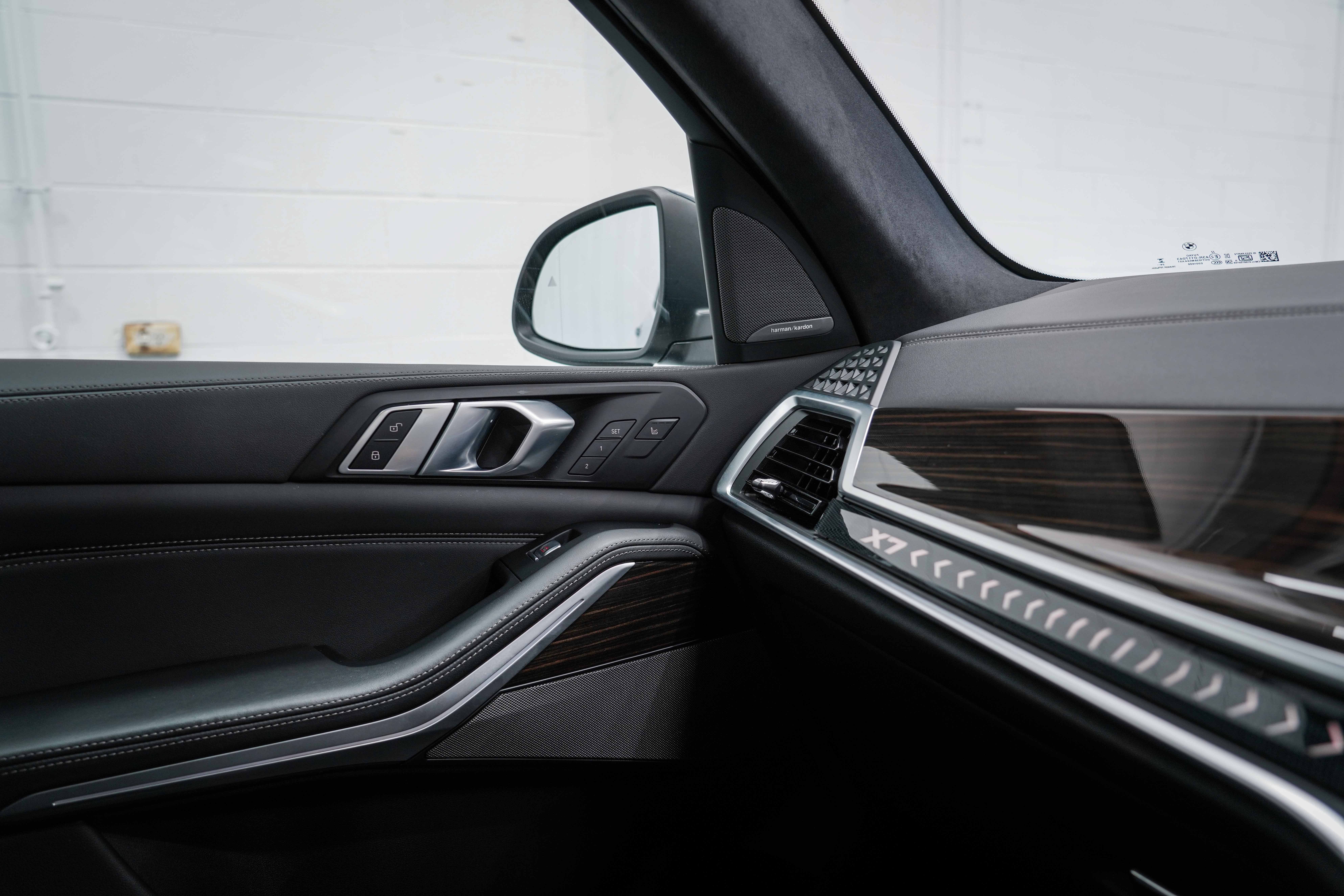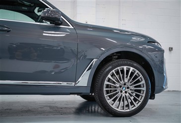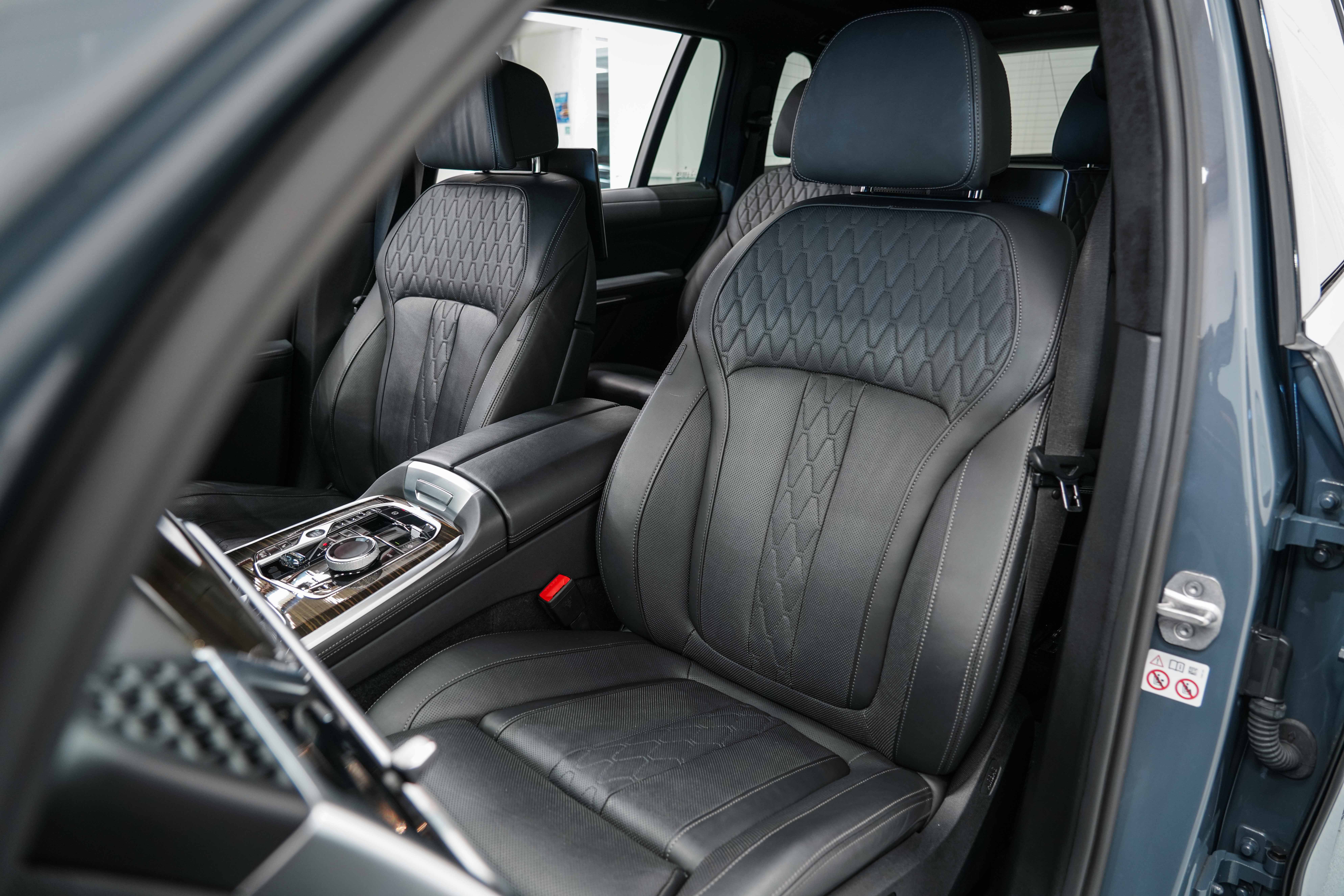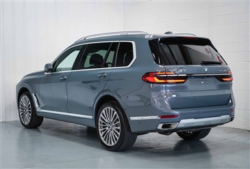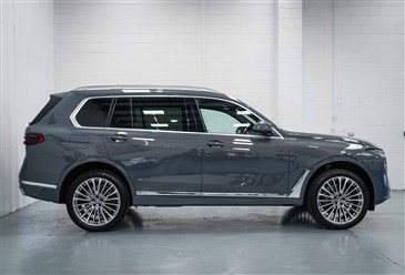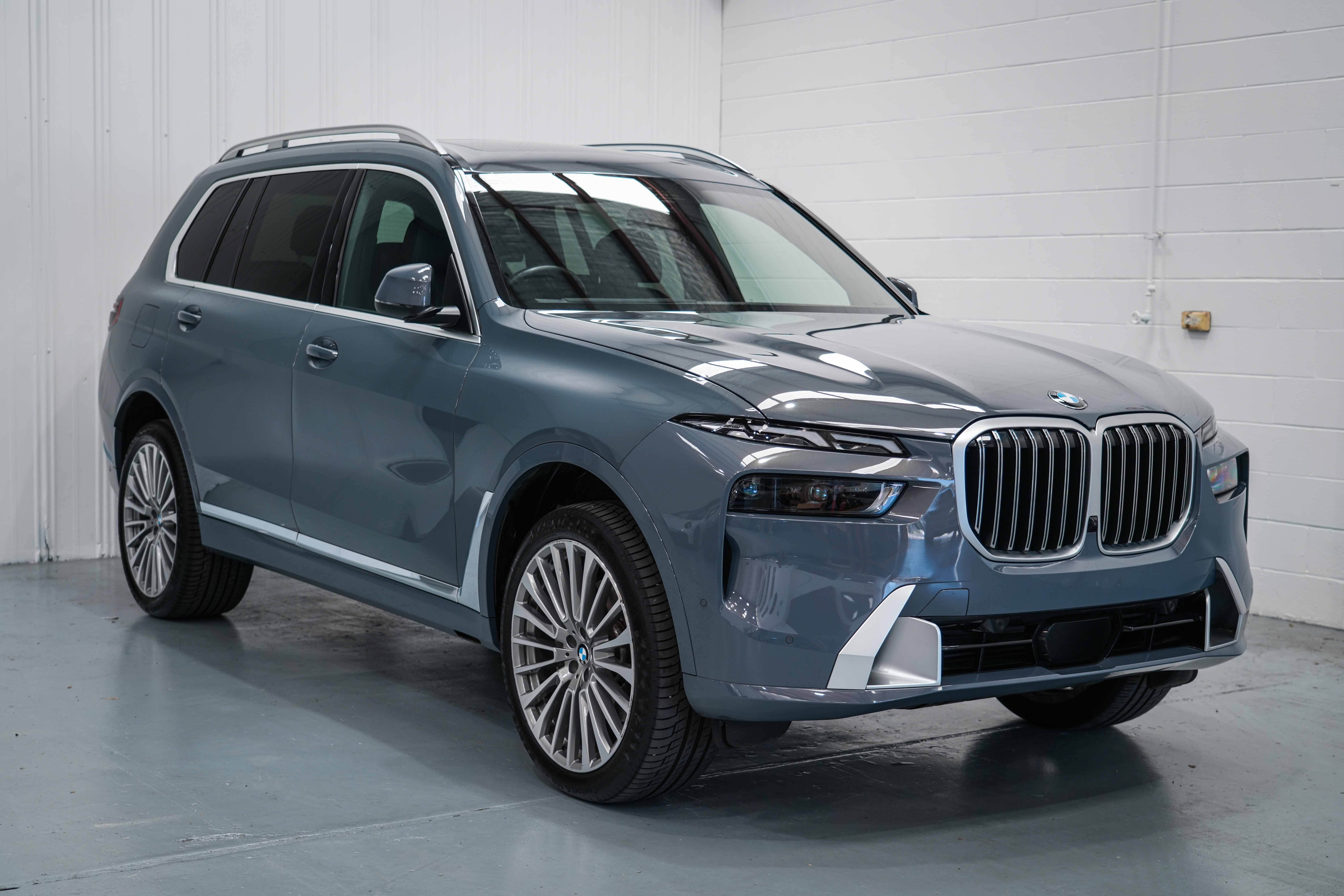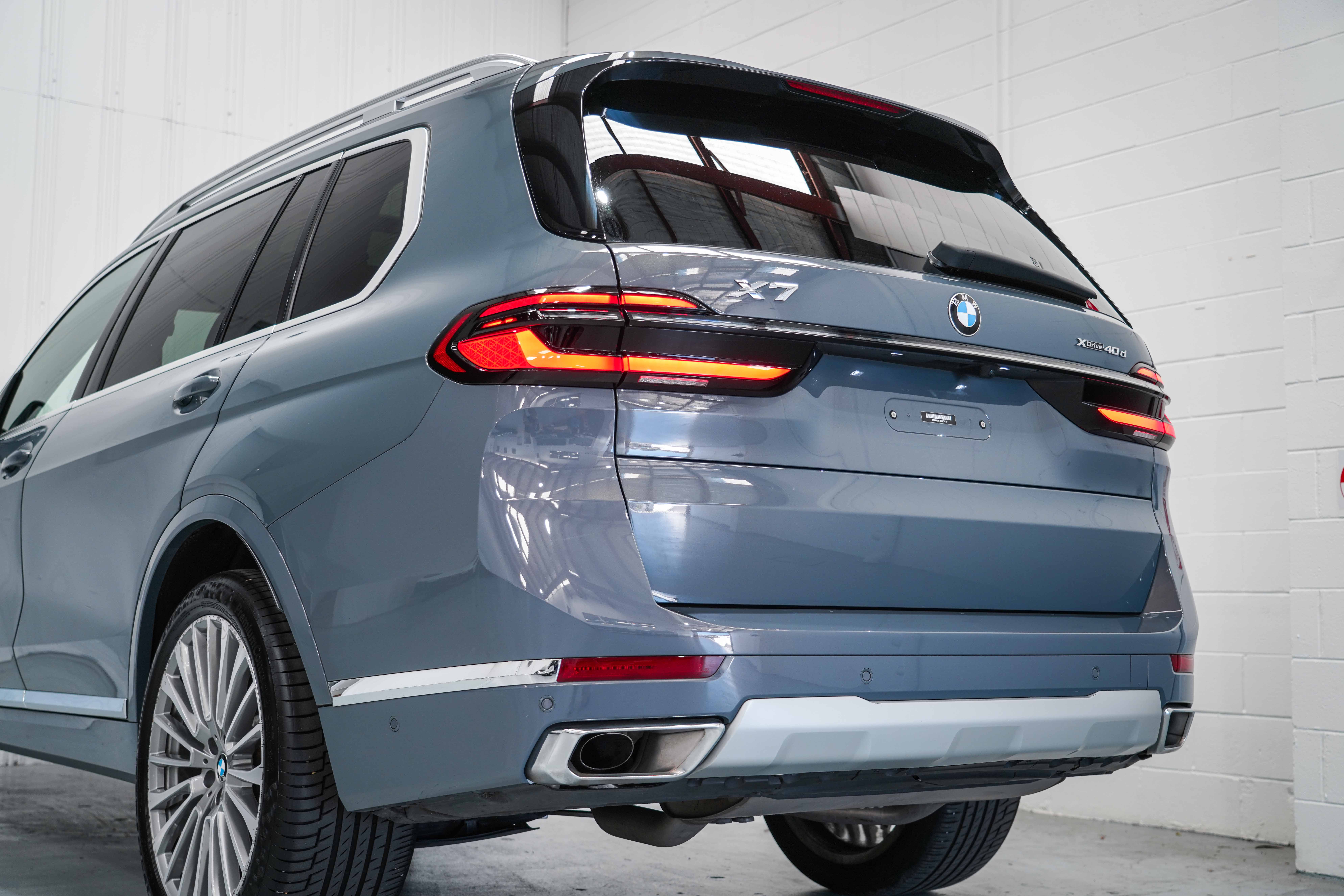 Distinctive chrome finishes on the exterior trim, refined interior materials, bright silver lower bumper inserts, and high-gloss details — giving the X7 a sophisticated, luxury-first presence compared to the sportier M Sport trim.