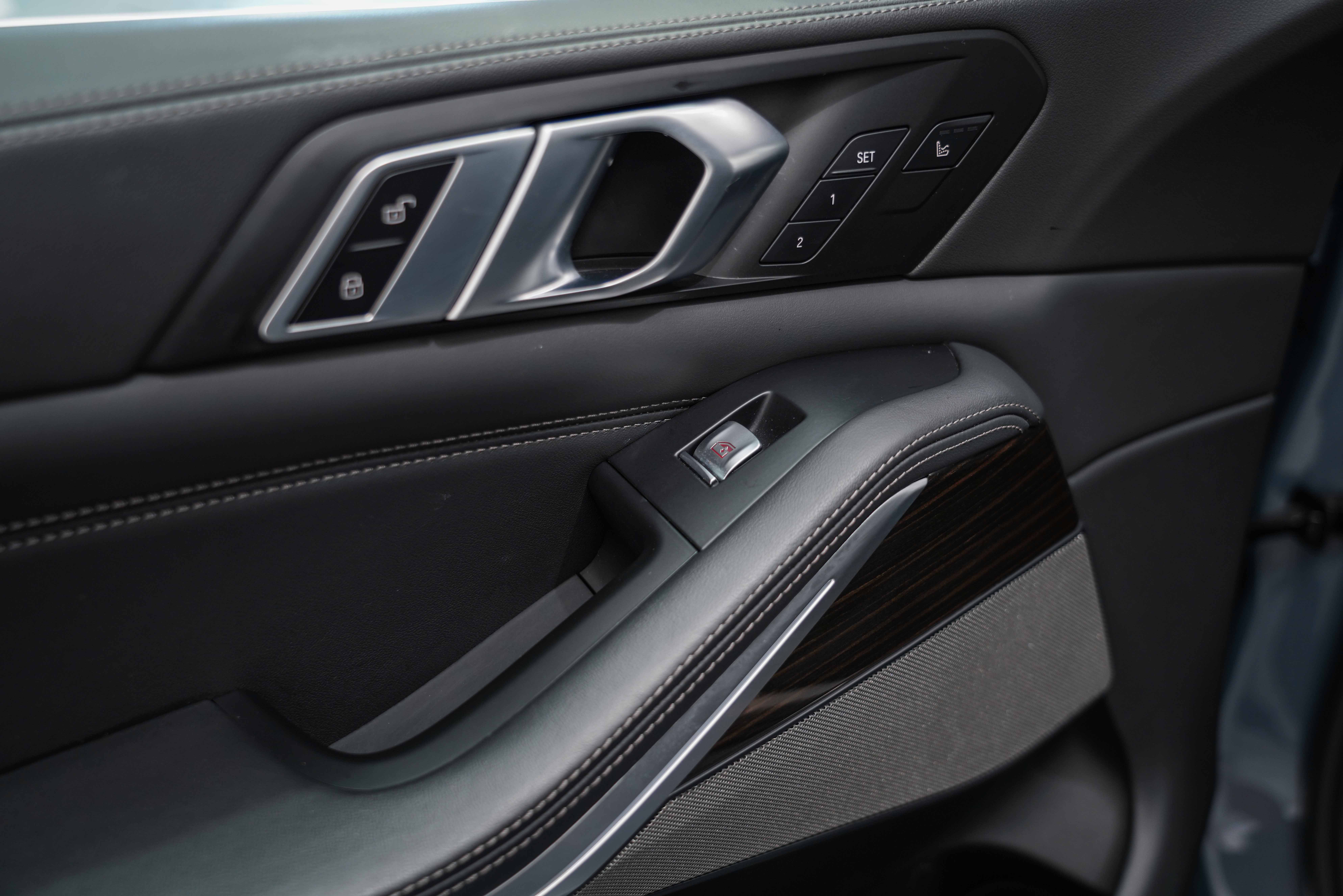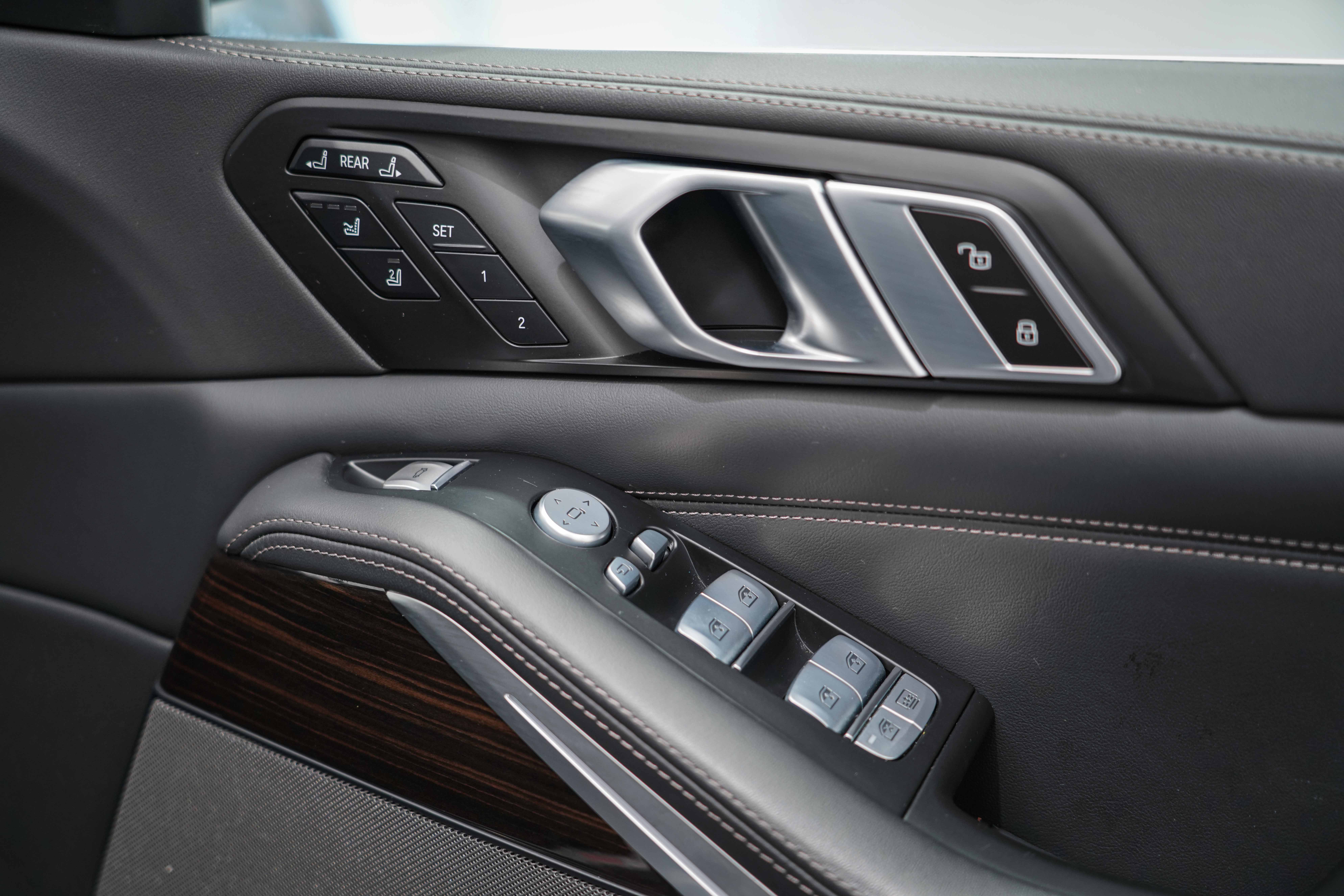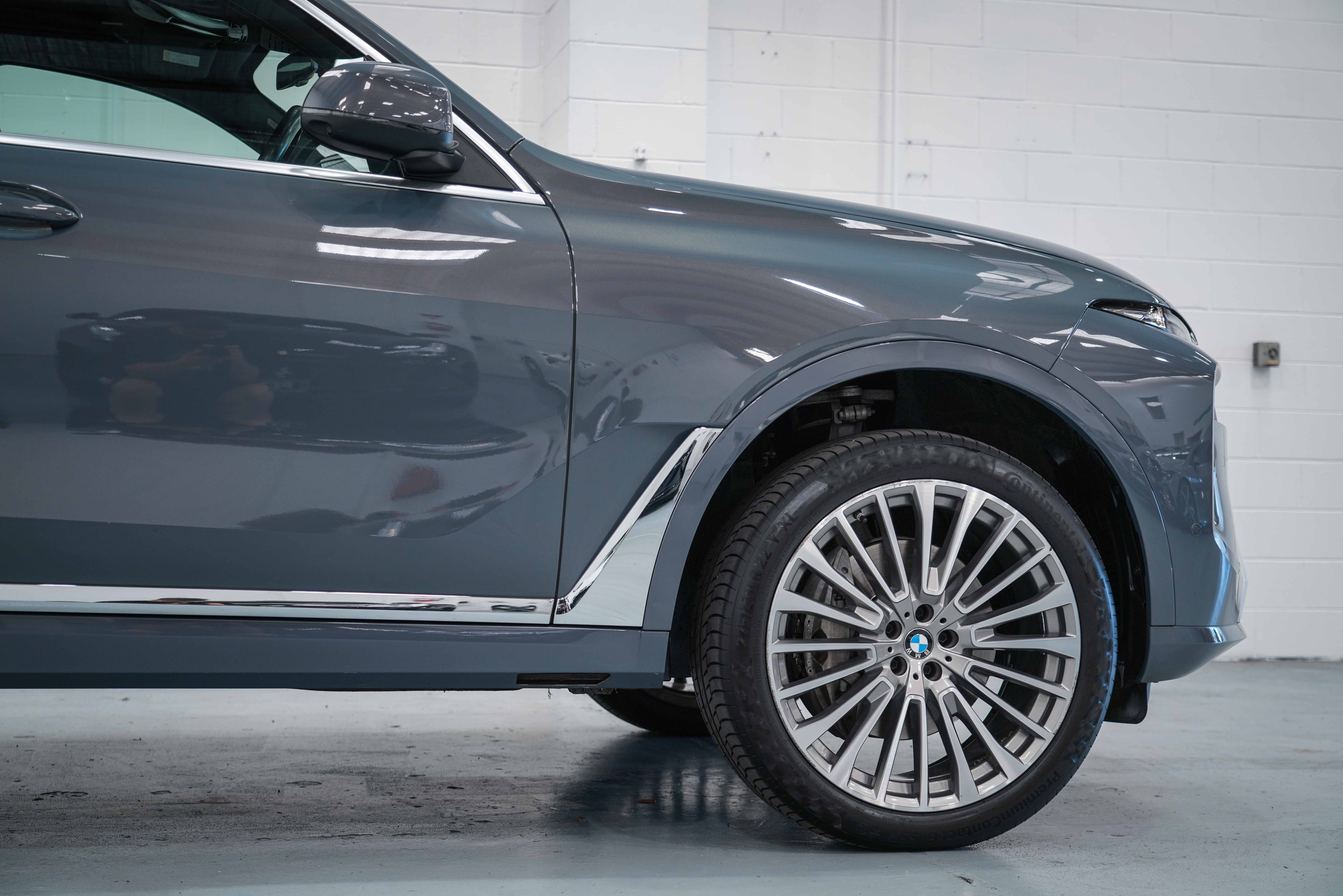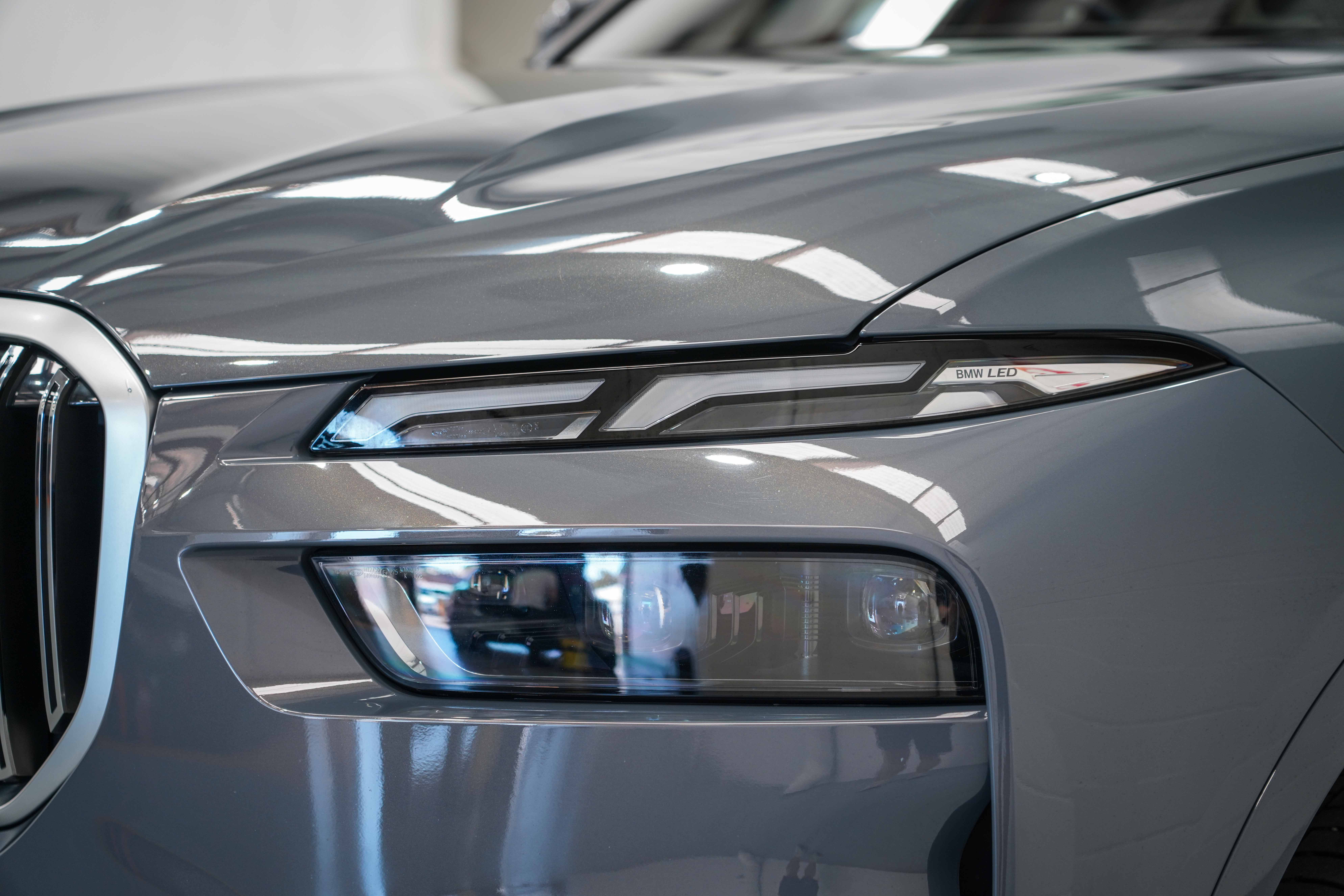 Distinctive chrome finishes on the exterior trim, refined interior materials, bright silver lower bumper inserts, and high-gloss details — giving the X7 a sophisticated, luxury-first presence compared to the sportier M Sport trim.